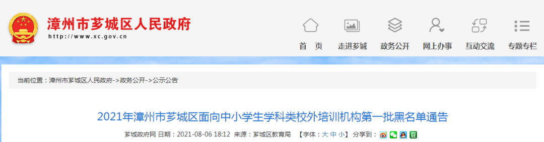 臺海網(wǎng)8月7日訊 據(jù)福建日報·新福建APP報道 昨日,漳州市薌城區(qū)人民政府網(wǎng)發(fā)布2021年漳州市薌城區(qū)面向中小學生學科類校外培訓機構第一批黑名單通告。