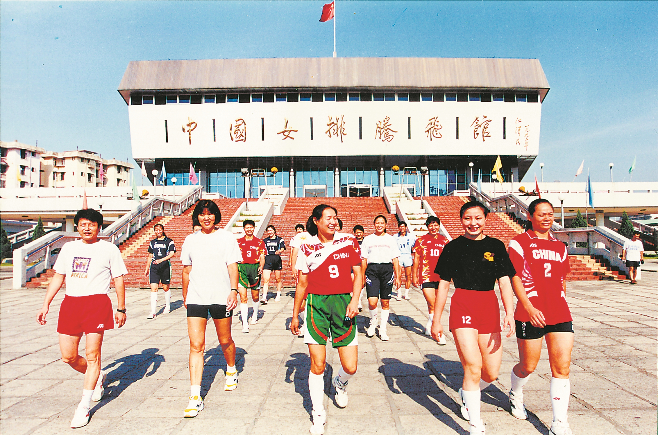 1998年,時(shí)任中國(guó)女排主教練郎平帶領(lǐng)訓(xùn)練結(jié)束后的全體隊(duì)員走出騰飛館。陳明杰 攝