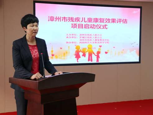 圖為漳州市殘聯(lián)黨組書記、理事長(zhǎng)汪清樺在啟動(dòng)儀式上致辭