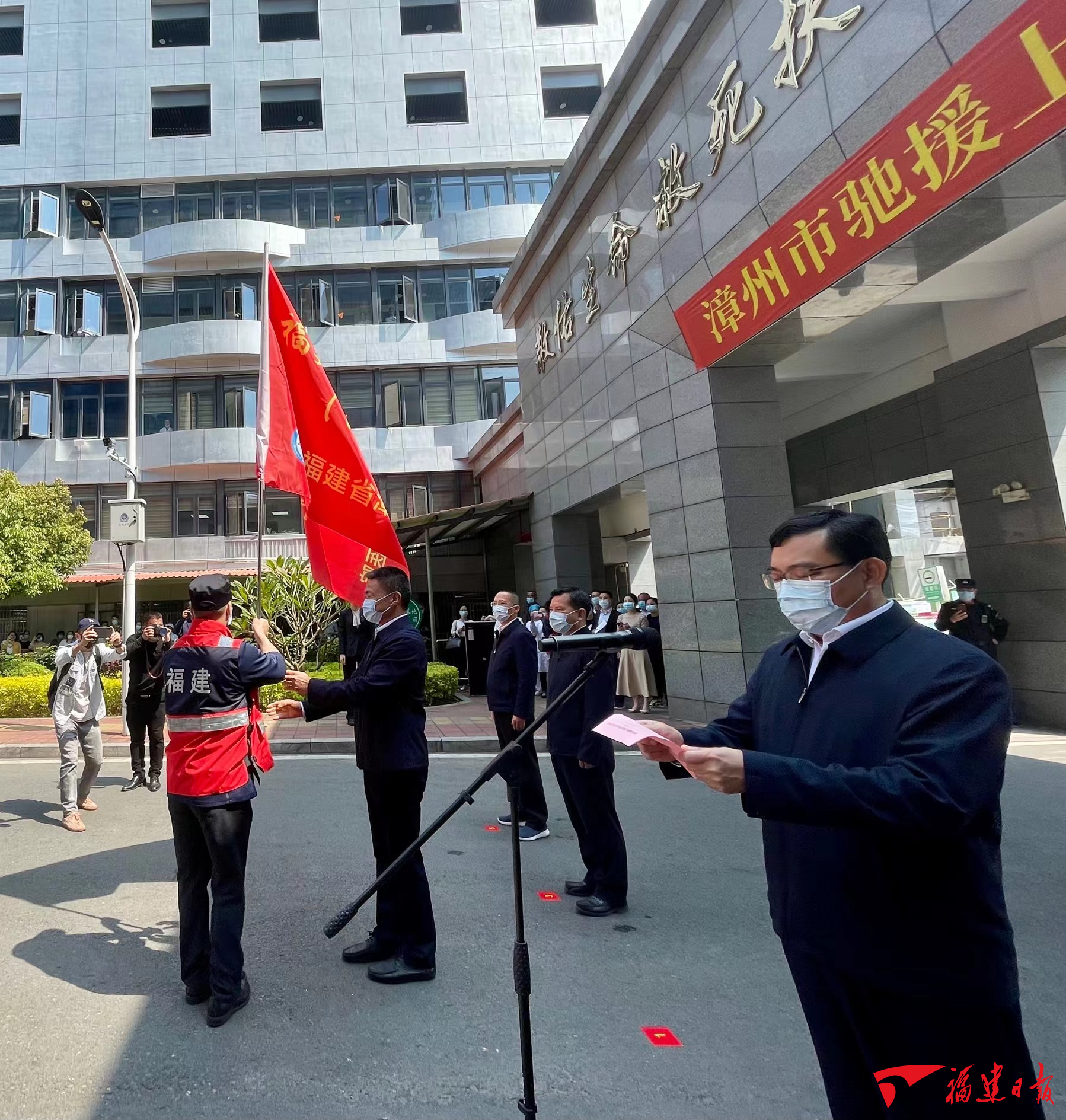 臺(tái)海網(wǎng)4月7日訊 據(jù)福建日?qǐng)?bào)·新福建客戶端報(bào)道 4月7日上午,福建援滬醫(yī)療隊(duì)(漳州隊(duì))出征儀式在漳州市醫(yī)院1號(hào)外科大樓前舉行。張國(guó)旺、王進(jìn)足、黃水木、吳衛(wèi)紅、廖卓文、余向紅等市領(lǐng)導(dǎo)等參加儀式。市委書記張國(guó)旺向福建援滬醫(yī)療隊(duì)(漳州隊(duì))領(lǐng)隊(duì)阮敏毅授隊(duì)旗并發(fā)表講話,市長(zhǎng)王進(jìn)足主持儀式。