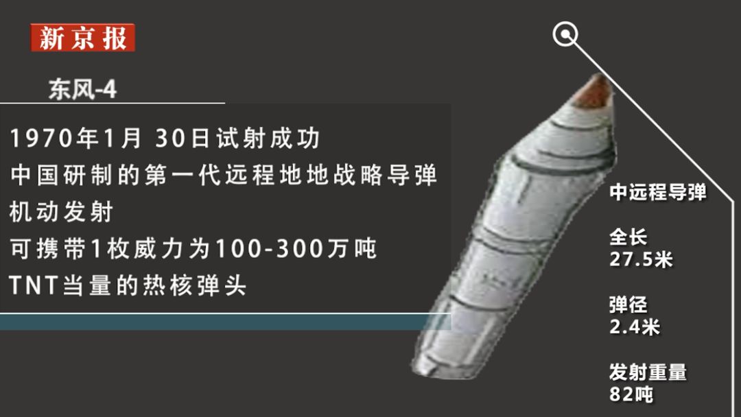 1970年1月 30日試射成功,中國研制的第一代遠(yuǎn)程地地戰(zhàn)略導(dǎo)彈,機(jī)動發(fā)射,可攜帶1枚威力為100-300萬噸TNT當(dāng)量的熱核彈頭。