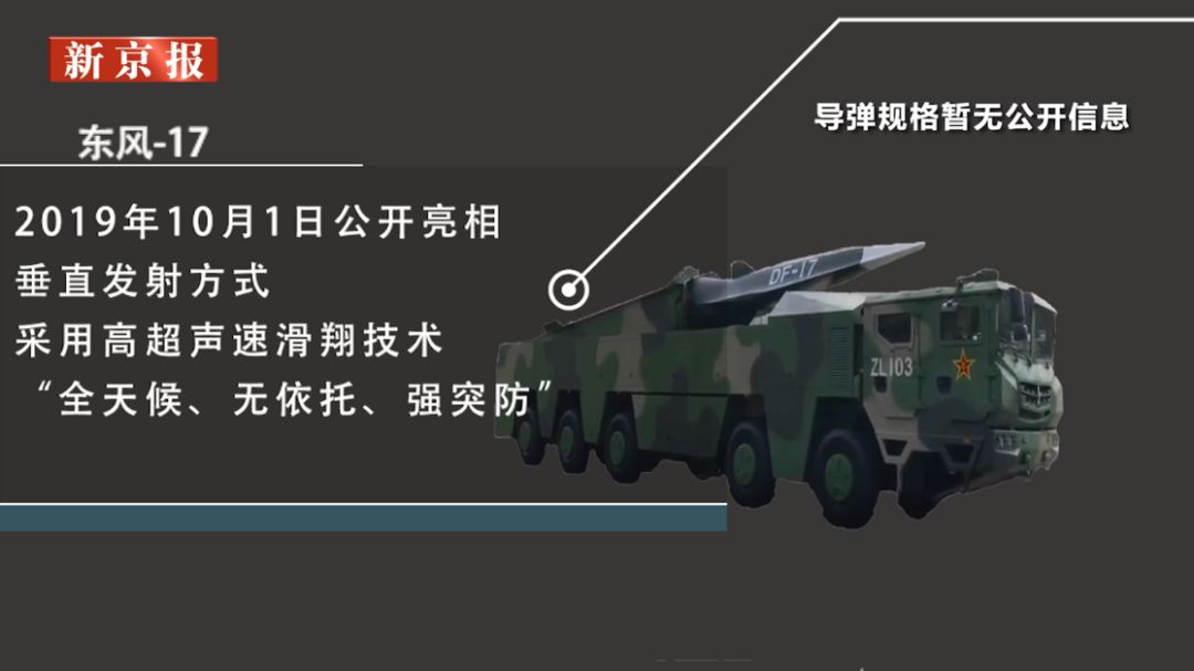 2019年10月1日公開亮相,垂直發(fā)射方式,采用高超聲速滑翔技術(shù),“全天候、無依托、強突防”。