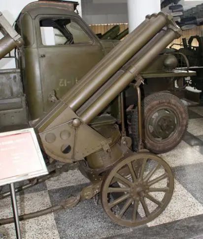 BM-13“喀秋莎”多管火箭炮20世紀30年代后期由蘇聯(lián)沃羅涅日兵工廠研制成功并生產(chǎn),十六管聯(lián)裝,一次齊射可發(fā)射132毫米火箭彈16枚,運載車同時就是發(fā)射車,火力猛,機動性高。它在蘇聯(lián)衛(wèi)國戰(zhàn)爭中大顯神威,剛投入使用時出于保密原因,沒有命名專門的名稱,只是在炮架上有個生產(chǎn)廠的字母標記“K”,就被蘇軍士兵親昵地叫做“喀秋莎”。