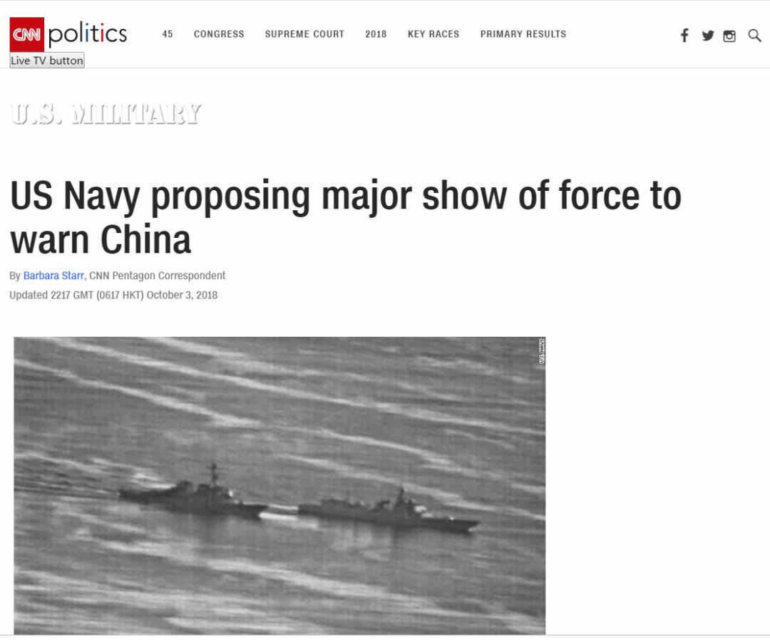 CNN3日的一則獨(dú)家報(bào)道稱,多名美國(guó)國(guó)防部官員透露,美軍太平洋艦隊(duì)已經(jīng)制定了一項(xiàng)秘密提案,計(jì)劃在全球范圍內(nèi)展示武力警告中國(guó)。