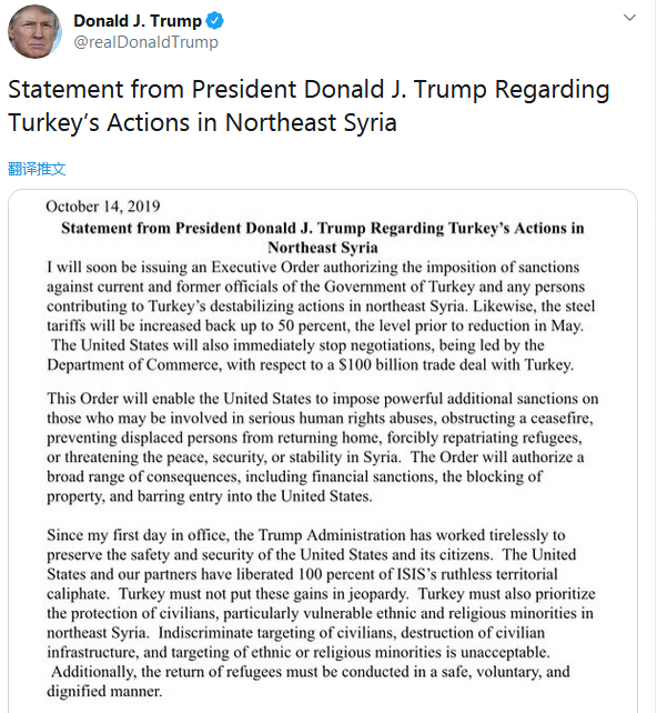 特朗普也在聲明中表示,美國(guó)及其合作伙伴已經(jīng)“從極端組織手中奪回了百分之百的土地。”他表示此前“清楚地向土耳其總統(tǒng)埃爾多安”表示,土耳其的行動(dòng)正引發(fā)一場(chǎng)人道危機(jī),可能滿(mǎn)足了戰(zhàn)爭(zhēng)罪的條件。“不幸的是,土耳其看起來(lái)沒(méi)有在侵略中降低人道危機(jī)。”