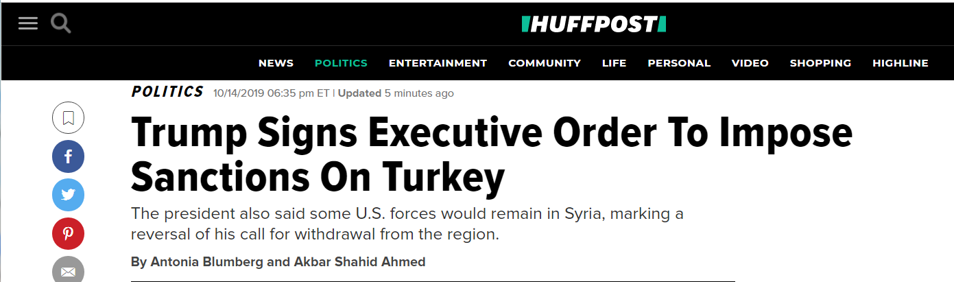 【環(huán)球網(wǎng)報(bào)道 記者 趙建東】據(jù)美國(guó)《赫芬頓郵報(bào)》消息,當(dāng)?shù)貢r(shí)間14日下午,美國(guó)總統(tǒng)特朗普簽署行政命令,對(duì)土耳其政府的部分官員實(shí)施制裁和簽證禁令。