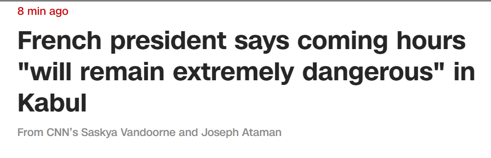 美國有線電視新聞網(wǎng)(CNN)剛剛消息,法國總統(tǒng)馬克龍表示,喀布爾接下來幾個(gè)小時(shí)仍然“極其危險(xiǎn)”。