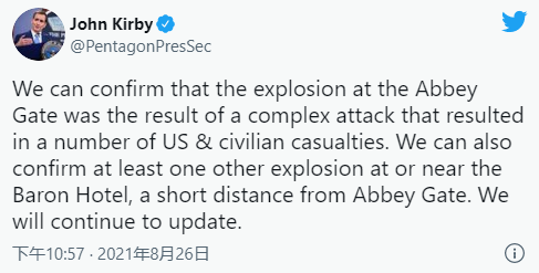 他在推特上寫道:“我們可以確認(rèn),艾比門的爆炸事件是一次復(fù)雜襲擊造成的結(jié)果,這次襲擊造成了美國人和一些平民傷亡。我們還可以證實(shí),至少還有一起爆炸事件發(fā)生在距離艾比門不遠(yuǎn)的巴隆酒店或巴隆酒店附近。我們會(huì)持續(xù)更新。”