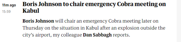 英國《衛(wèi)報(bào)》剛剛消息,首相約翰遜將于當(dāng)?shù)貢r(shí)間26日晚些時(shí)候主持一場(chǎng)緊急會(huì)議,討論喀布爾機(jī)場(chǎng)外爆炸事件。