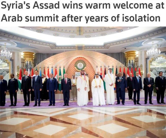 △路透社報道截圖(題圖為5月19日出席阿盟峰會的領(lǐng)導(dǎo)人合影。左四為敘利亞總統(tǒng)巴沙爾)