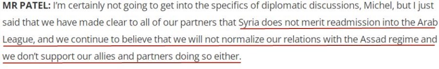 美國國務(wù)院發(fā)言人韋丹特·帕特爾公然宣稱:“敘利亞不值得被重新接納進入阿盟,我們?nèi)匀徊粫c敘利亞政府實現(xiàn)關(guān)系正?;膊恢С治覀兊拿擞押突锇檫@樣做。”