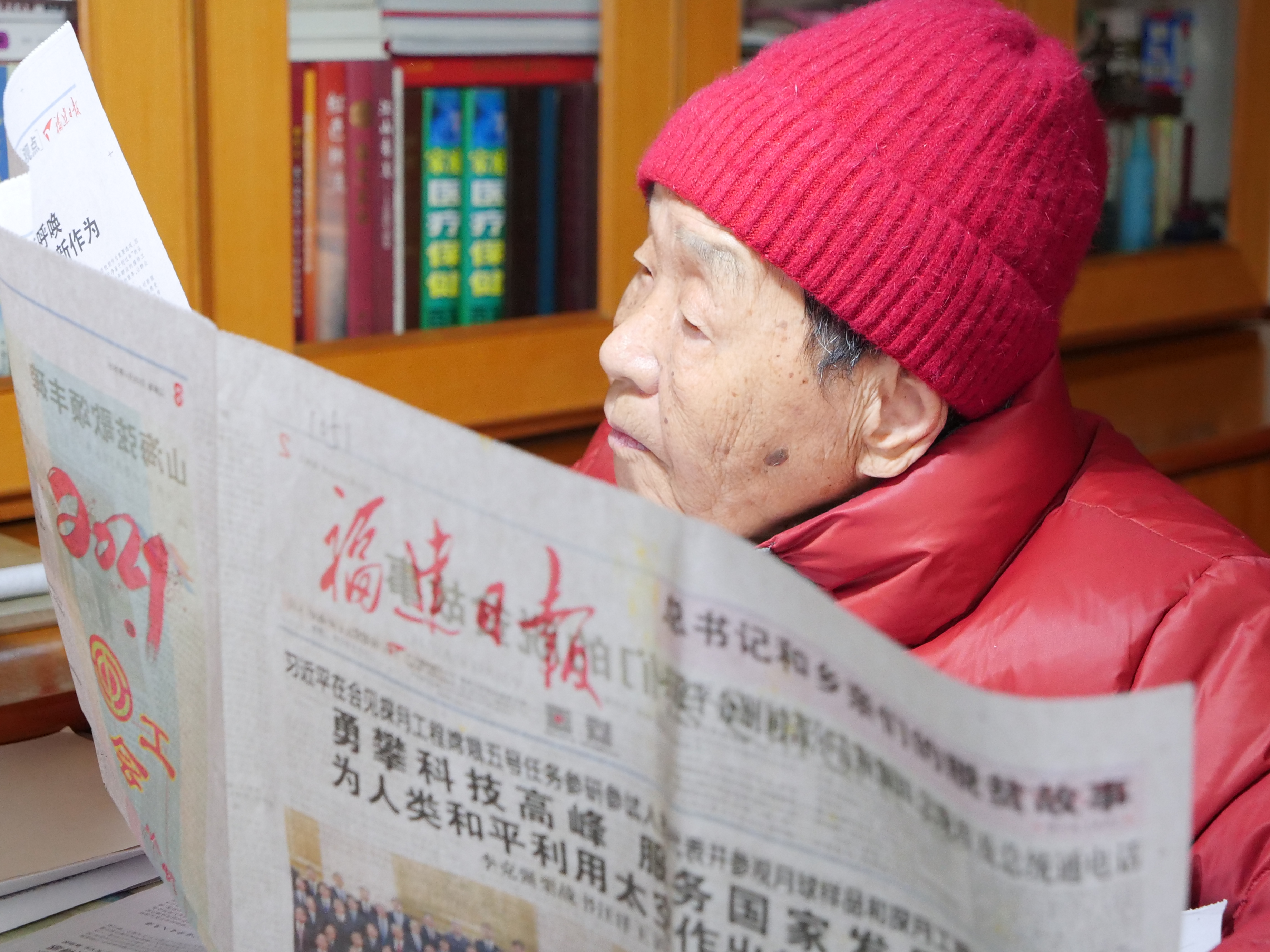 ↑新四軍老戰(zhàn)士尹峰雖然近99歲高齡,仍然每天堅(jiān)持讀報(bào)。新華社記者 郭圻 攝