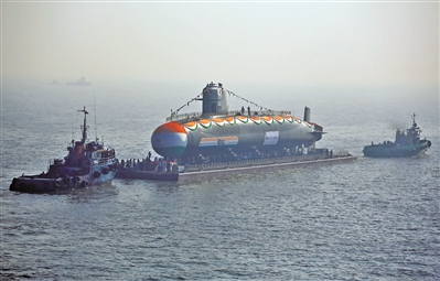 印度卡爾瓦里級(jí)常規(guī)潛艇“卡蘭杰”號(hào)在孟買海軍基地下水(資料圖)