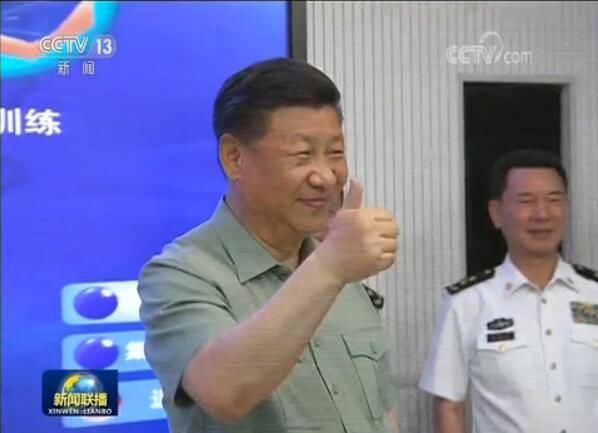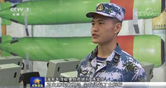 在聲吶聽音訓(xùn)練室,習主席現(xiàn)場出題抽考,官兵們踴躍作答,聲吶兵蔣金良報出的答案準確無誤,習主席豎起大拇指為他點贊。
