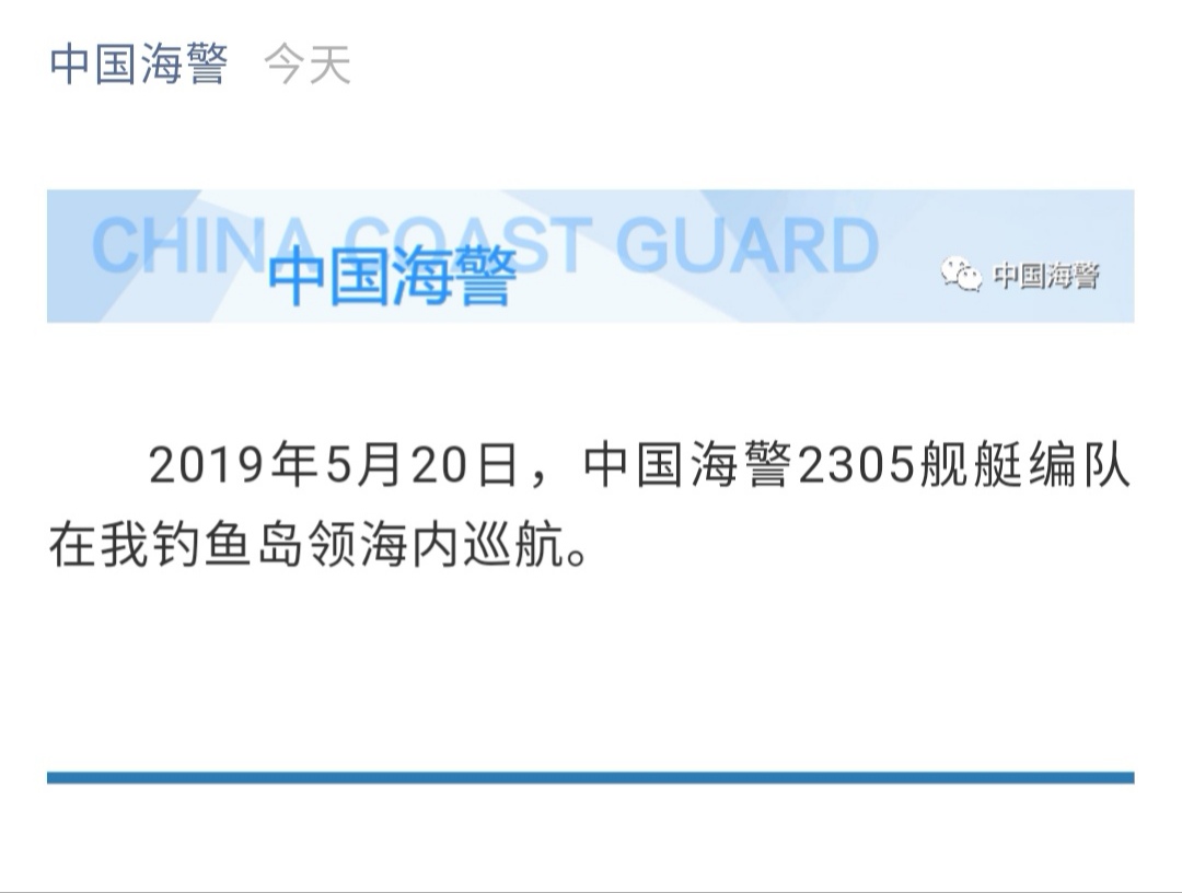 據(jù)@中國海警消息,2019年5月20日,中國海警2305艦艇編隊(duì)在我釣魚島領(lǐng)海內(nèi)巡航。