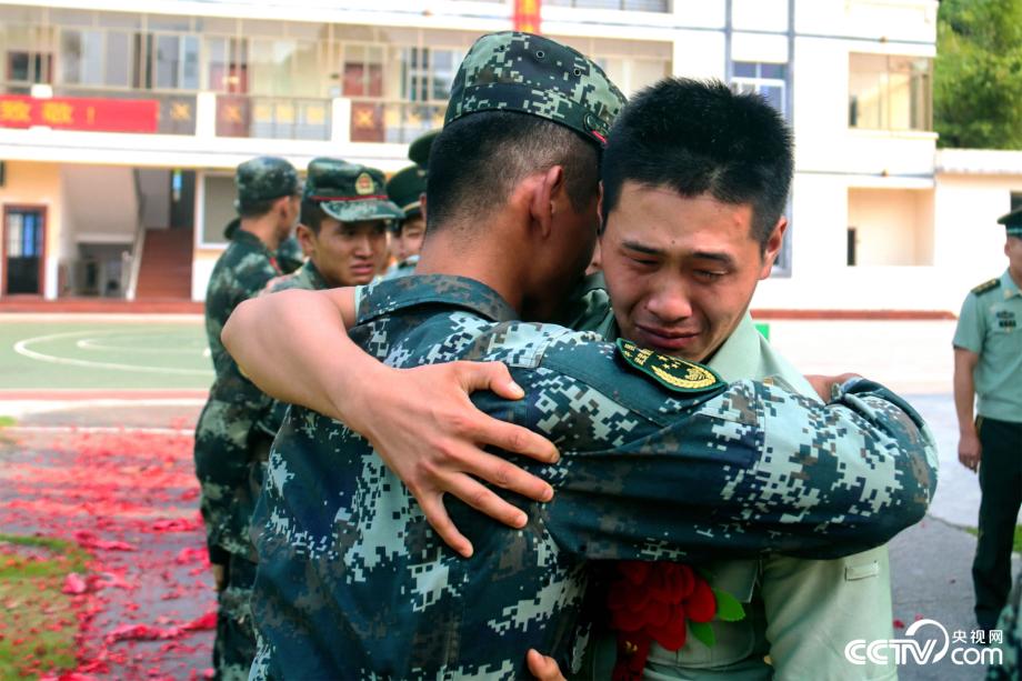 退伍老兵離營時(shí)與戰(zhàn)友緊緊相擁。(王勁帆 黃祝敏 奎子清)