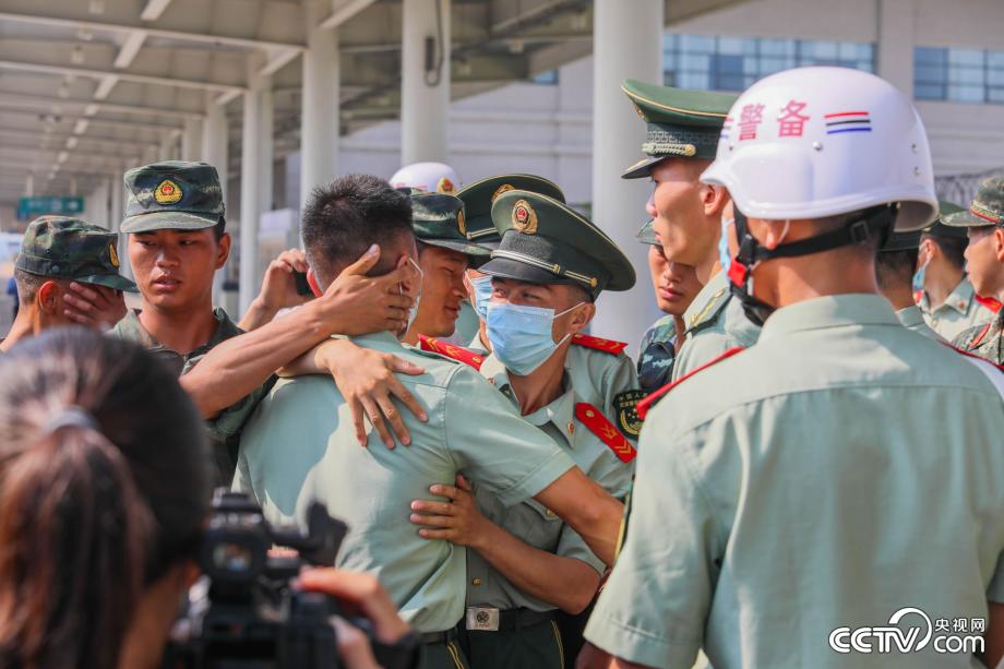 退伍老兵與戰(zhàn)友相擁告別。(果志遠)