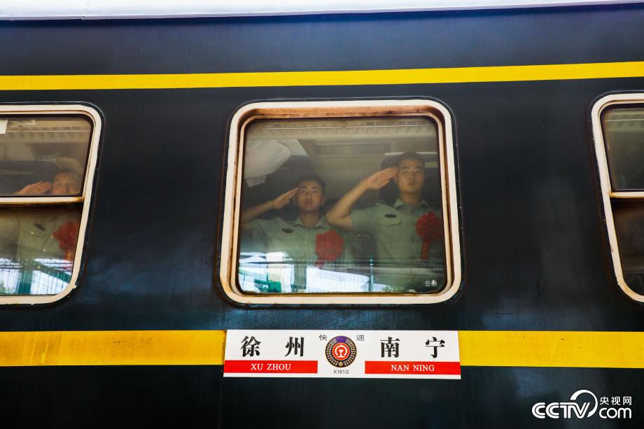 武警退伍老兵在列車上與戰(zhàn)友敬禮告別。(果志遠(yuǎn))