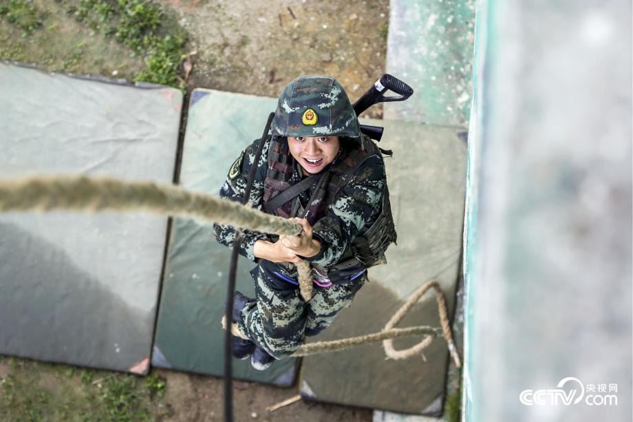 參賽官兵進(jìn)行抓繩上攀登。(奎子清)