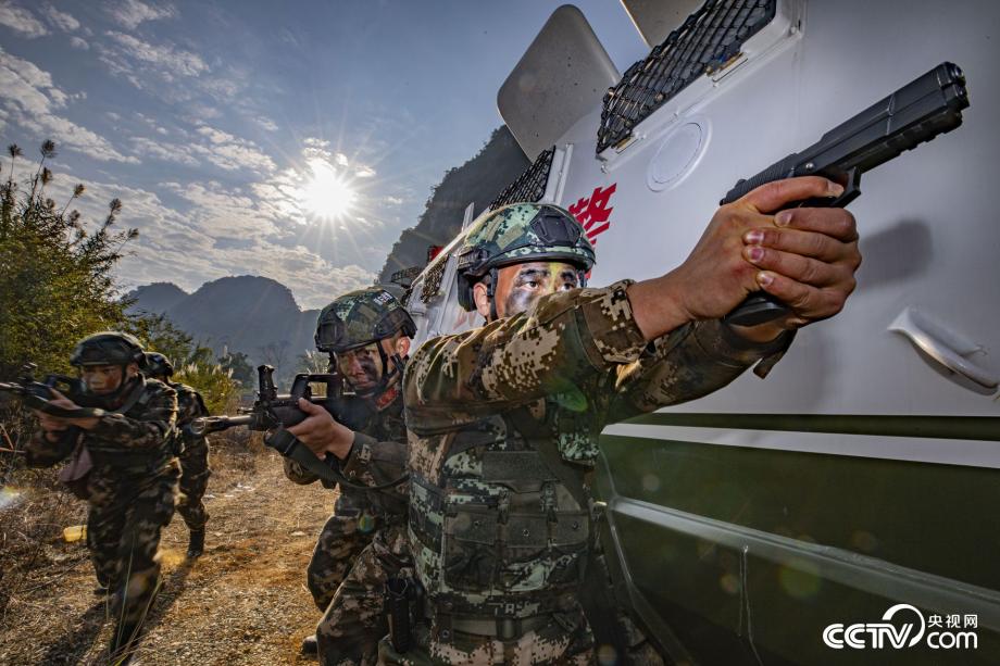 武警官兵掩護(hù)隊(duì)友追擊“暴恐分子”。