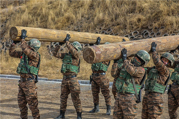 ↑托舉圓木訓(xùn)練。徐朝偉 攝