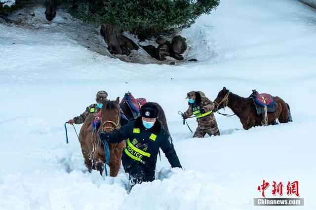 因巡邏路線被大雪覆蓋,民警帶領(lǐng)護(hù)邊員牽馬在齊腰深的積雪中步行前往達(dá)坂。 郭瑋 攝