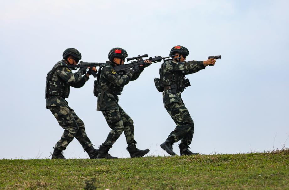 武警官兵三人協(xié)同訓(xùn)練。柴浩攝影