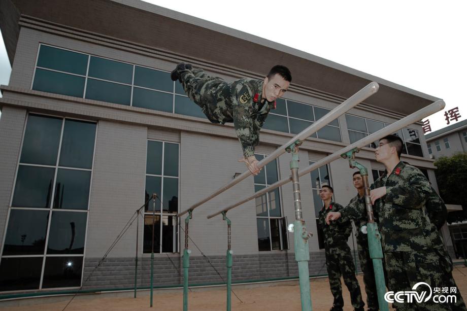 武警廣西總隊(duì)南寧支隊(duì)官兵正在進(jìn)行雙杠五練習(xí)訓(xùn)練。