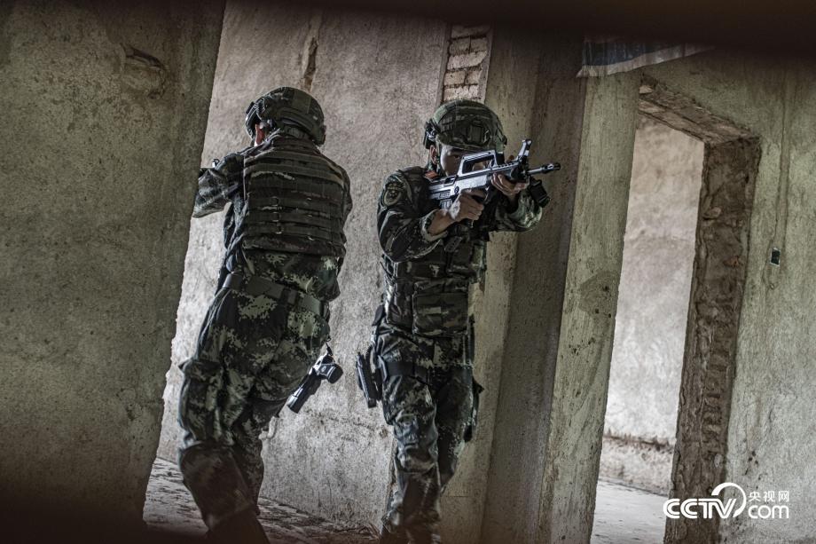 武警官兵在房屋內(nèi)交替掩護隱蔽搜索。