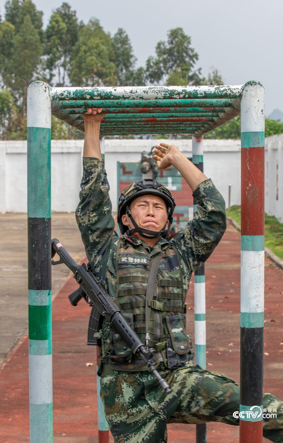 武警官兵正在快速通過云梯。