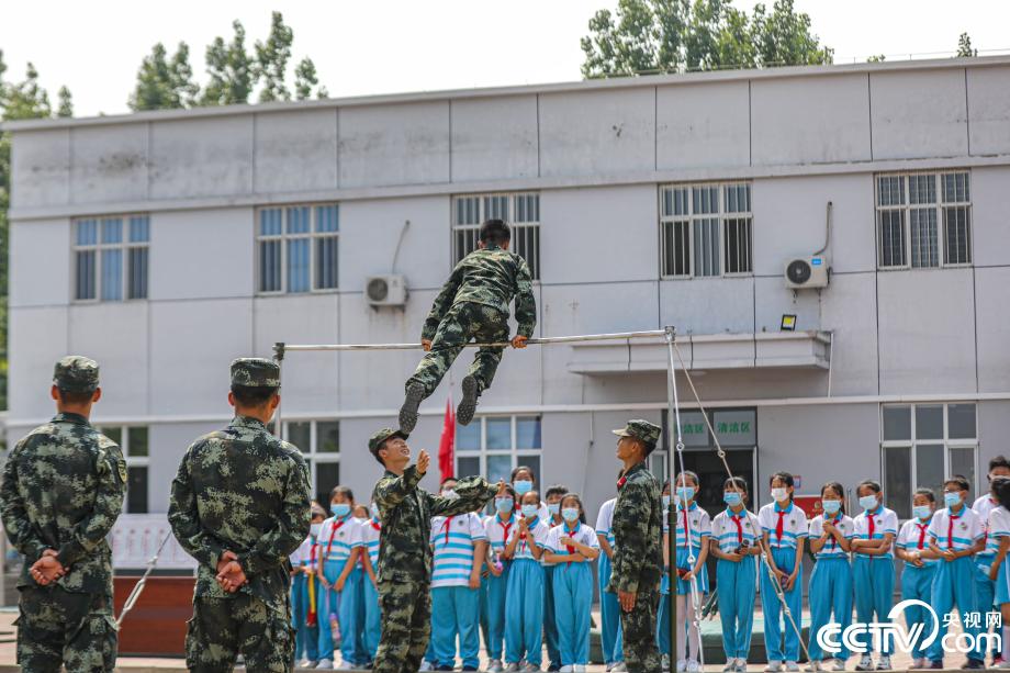 官兵們向小學(xué)生展示器械訓(xùn)練。