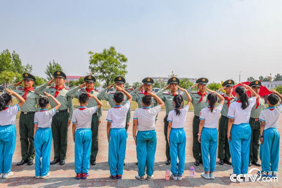 小學生們?yōu)楣俦宕骷t領巾后,雙方紛紛致敬,互相敬禮。