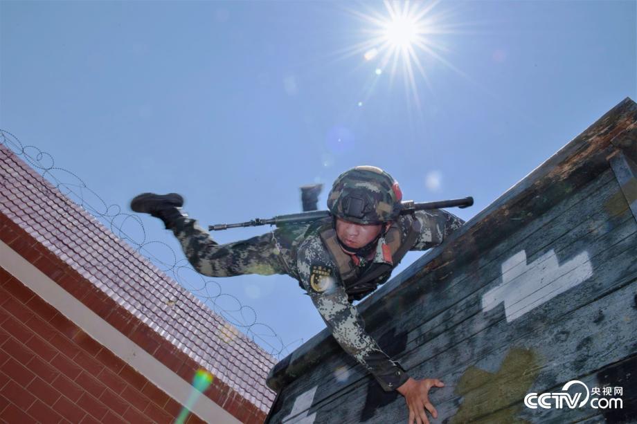 武警官兵在烈日下進行翻越高墻訓練。