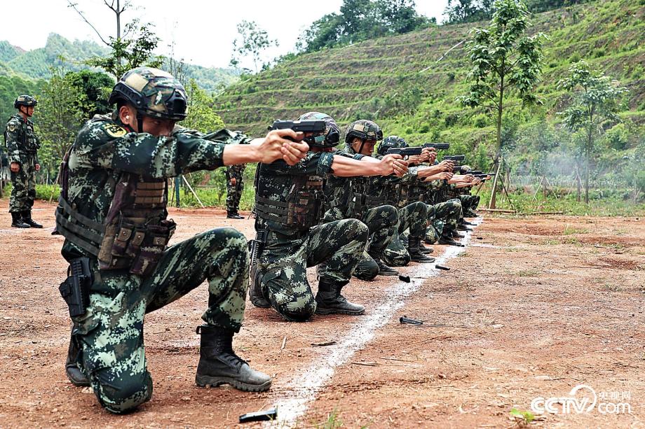特戰(zhàn)官兵正在進(jìn)行手槍多姿勢射擊。