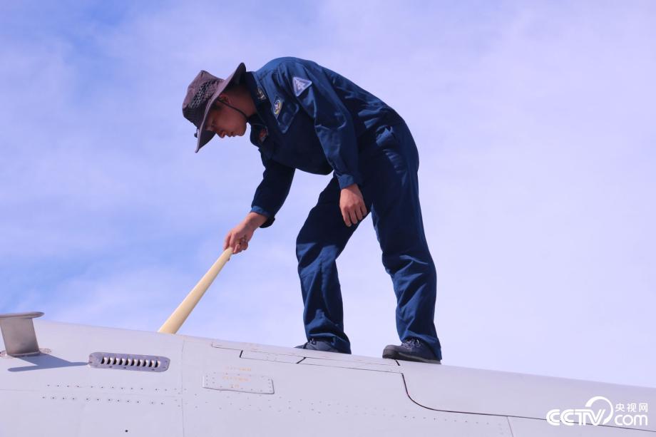 圖為機(jī)務(wù)官兵認(rèn)真檢查戰(zhàn)機(jī)。