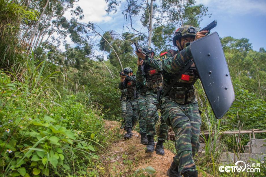 武警特戰(zhàn)隊員小組協同搜索目標。