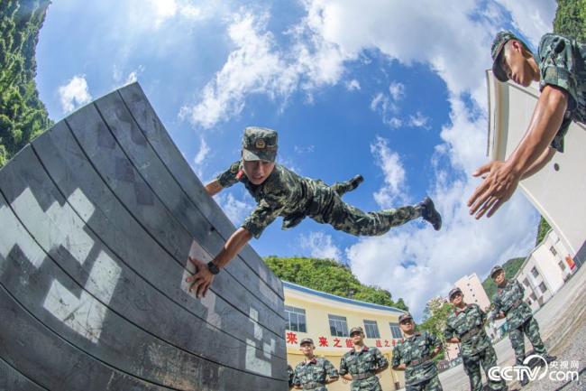 400米障礙訓練中,一名戰(zhàn)士快速翻越高板。
