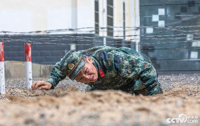 400米障礙訓練中,一名戰(zhàn)士快速通過低樁網(wǎng)。