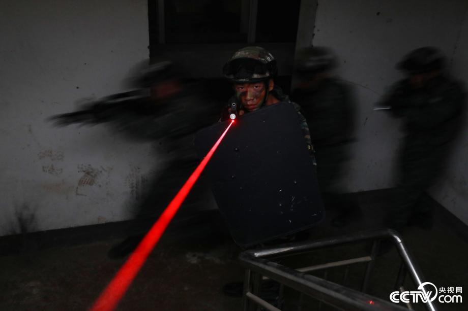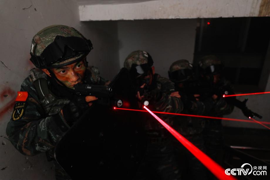 圖為武警特戰(zhàn)隊(duì)員搜索目標(biāo)。來源:央視網(wǎng)