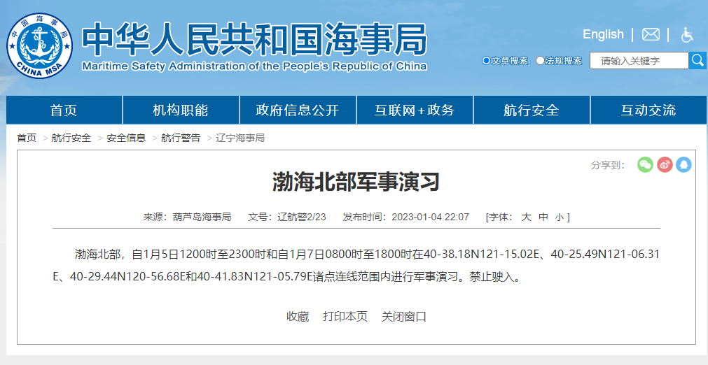 渤海北部,自1月5日12時(shí)至23時(shí)和自1月7日08時(shí)至18時(shí)在40-38.18N121-15.02E、40-25.49N121-06.31E、40-29.44N120-56.68E和40-41.83N121-05.79E諸點(diǎn)連線范圍內(nèi)進(jìn)行軍事演習(xí)。禁止駛?cè)搿?/p>