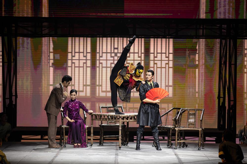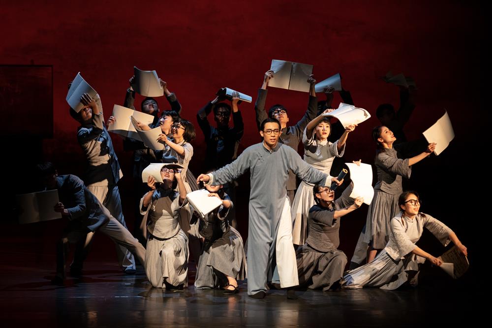 獲獎作品《努力餐》的故事發(fā)生于1930年代日本侵華戰(zhàn)爭時期,以地下革命先驅(qū)車耀先烈士的故事為原型進行創(chuàng)作,講述了一代共產(chǎn)黨人如何在餐樓的掩護下開展革命工作、捍衛(wèi)信仰的生死暗戰(zhàn)。在舞臺呈現(xiàn)上,編導(dǎo)使用了現(xiàn)代化的科技手段去增加光影和道具的變化,例如隱秘印刷《大聲》周刊,宣傳抗日救亡的群舞片段。