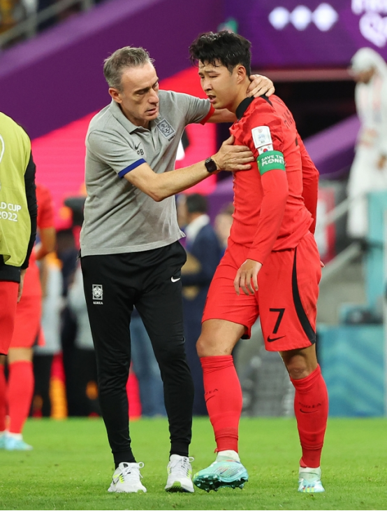 賽后,韓國主帥保羅·本托(圖左)在現(xiàn)場安慰孫興慜。 圖自韓媒