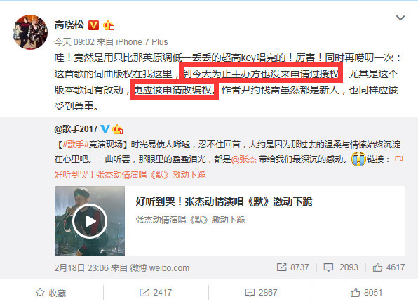 騰訊娛樂訊 2月19日上午9點(diǎn),高曉松發(fā)文指責(zé)《歌手》在第五期節(jié)目中張杰演唱的歌曲《默》未經(jīng)過授權(quán)就擅自演唱,侵犯了作為版權(quán)所有者的自己與作者尹約、錢雷的權(quán)益。高曉松寫道:“這首歌的詞曲版權(quán)在我這里,到今天為止主辦方也沒來申請過授權(quán)。尤其是這個(gè)版本歌詞有改動(dòng),更應(yīng)該申請改編權(quán)。作者尹約錢雷雖然都是新人,也同樣應(yīng)該受到尊重。”