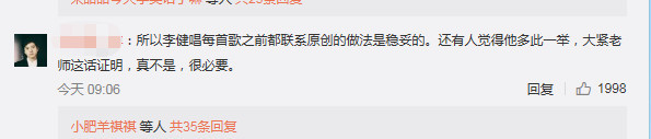 微博發(fā)布后,有網(wǎng)友留言稱:“所以李健唱每首歌之前都聯(lián)系原創(chuàng)的做法是穩(wěn)妥的。還有人覺得他多此一舉,大緊老師這話證明,真不是,很必要。”