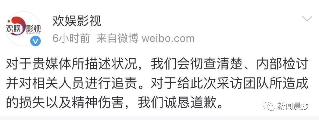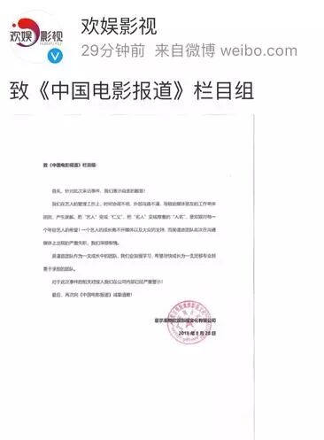 今天上午11點(diǎn),歡娛影視再發(fā)聲明,對《中國電影報(bào)道》節(jié)目組表示由衷的歉意,并在公司內(nèi)部已嚴(yán)重警示當(dāng)日事件的相關(guān)對接人。