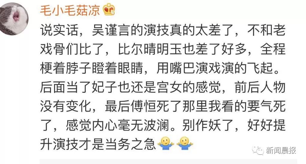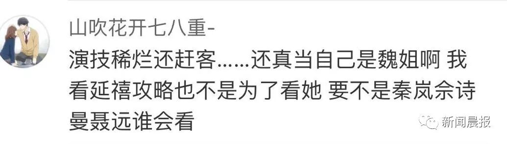 如果不是因?yàn)橐粠脱菁荚诰€的演員,還有誰會(huì)在意這個(gè)“令妃”?網(wǎng)友認(rèn)為她即便由宮女升為妃子,依然在梗著脖子,瞪著眼睛,用嘴巴在演戲演得飛起,前后人物沒有變化。