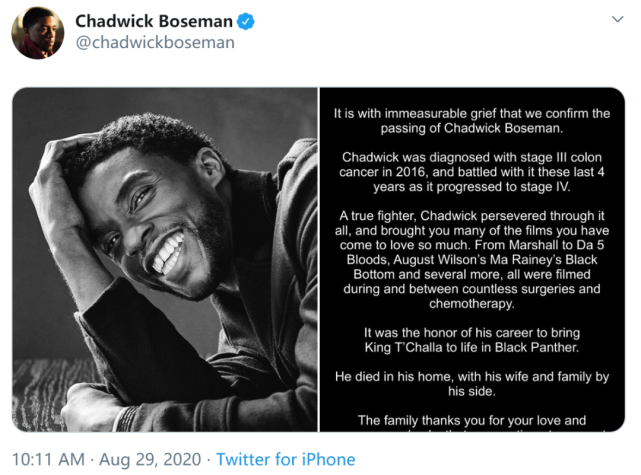 多家外媒此前消息稱,博斯曼因患結(jié)腸癌去世,年僅43歲。博斯曼的家人在他的推特賬號上公布了這一消息,“我們懷著無限悲傷,確認查德威克·博斯曼已經(jīng)去世。”英國廣播公司(BBC)稱,博斯曼在家人的陪伴下于洛杉磯家中去世,他已患結(jié)腸癌長達4年時間。