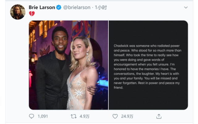 “查德維克是一個充滿力量而又平靜的人,他所代表的比他自己本身要多得多。”布麗·拉爾森在推特上寫道,“我很榮幸擁有這些記憶,那些談話,那些笑聲。我的心與你和你的家人同在。人們會永遠懷念你,永遠不會忘記你。我的朋友,在力量與和平中安息吧。”