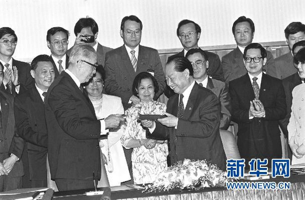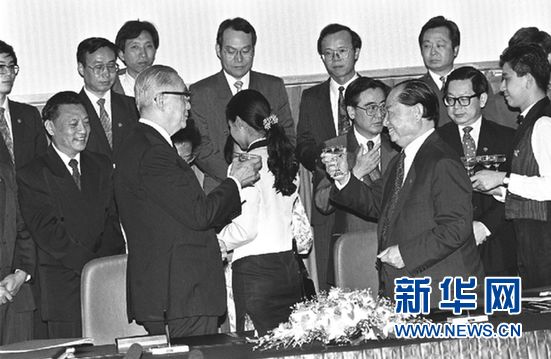 1993年4月29日,大陸海協(xié)會與臺灣海基會在新加坡簽署《汪辜會談共同協(xié)議》等4個協(xié)議。汪道涵和辜振甫在協(xié)議上簽字后,相互祝酒。 新華社記者劉建生攝