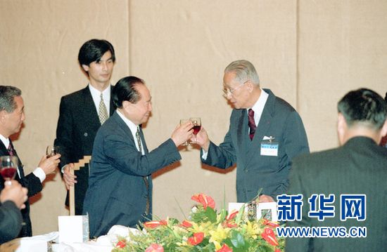 1998年10月15日,辜振甫在上海波特曼大酒店舉行答謝宴會。這是汪道涵和辜振甫在宴會上。新華社記者張明攝